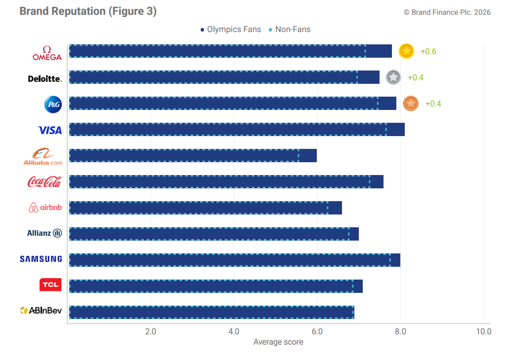 Among the 11 brands, Omega, Deloitte, and P&G saw the largest boosts in reputation, with increases of +0.6, +0.4, and +0.4 points, respectively (Figure 3).