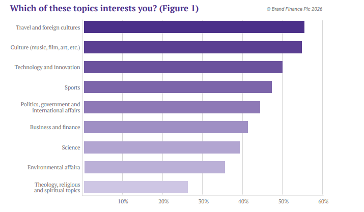 According to Brand Finance’s Global Soft Power Index research, sport continues to rank among the most engaging cultural domains globally. Nearly half of respondents (47%) indicated they are interested in sport in this year’s study (Figure 1).