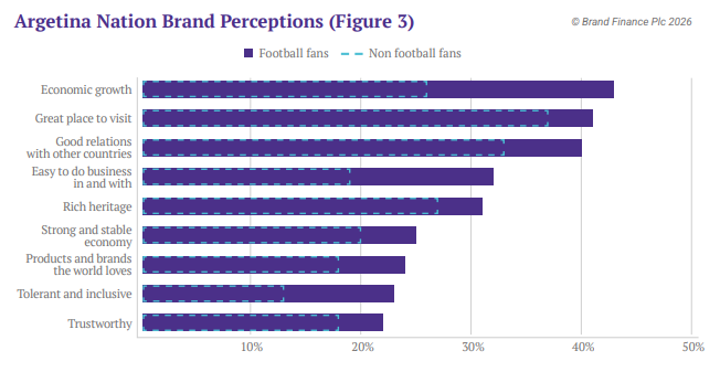 Brand Finance analysis of the AFA demonstrates how the nation’s football success, which is anchored by deep cultural heritage and iconic talent, translates into measurable improvements in perceptions across key dimensions of nation brand strength (Figure 3). Football‑engaged audiences associate Argentina more positively on attributes like economic growth, heritage, trustworthiness, ease of doing business, and good relations with other countries than non‑fans do. Those perception uplifts translate into increased willingness to visit, invest, study, and buy, which are important outcomes for policymakers and businesses (Figure 4).