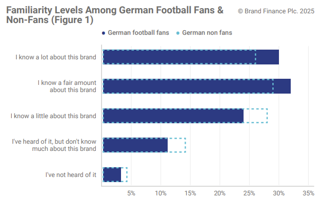 The first objective of the partnership will be to use Bayern Munich’s massive exposure to boost awareness and familiarity of the T brand in the German market. Brand Finance’s 2025 Global Brand Equity Monitor reveals a marked difference in awareness and familiarity with Deutsche Telekom’s T brand between football-following and non-football German consumers. Football fans show significantly higher awareness and familiarity of the T brand. Compared to data from two years ago, familiarity among football fans has grown notably, indicating a deepening connection between the brand and the football audience (Figure 1).