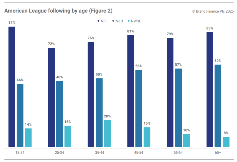 At the heart of this divide is generational behavior. The most followed league in the US is the National Football League (NFL), with 79% of Americans claiming to follow it, accounting for 90% of all football fans. What makes the NFL particularly unique is its reach across all age groups. From Gen Z to senior citizens, engagement remains high with 87% of 18–24 year olds following the league and 83% of those aged 65 and older. This unique consistency illustrates the NFL’s near-universal appeal.
