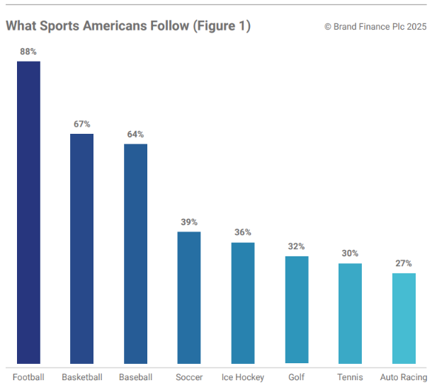 Every year, Brand Finance surveys American sports fans to understand where sponsorship value lies across the country’s most followed sports and leagues. Unsurprisingly, football dominates the landscape, with 88% of American sports fans following the sport. Basketball comes next at 67%, while soccer lags behind at 39%. Yet, beneath these broad statistics lies a more complex picture, one that reveals a growing mismatch between how fans perceive leagues and how they actually engage with them.
