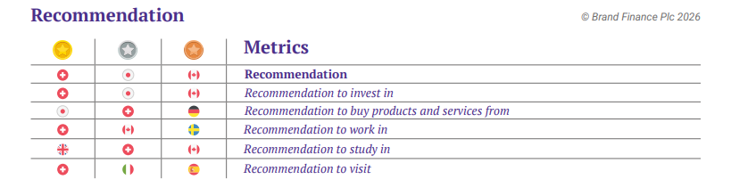 With 17 gold medals, including a world-leading Reputation, Switzerland is a global benchmark for stability, ethical governance, and trust, also leading in areas such as international relations and economic strength. Switzerland secures gold medals in three of the five Recommendation categories, complemented by silver medals in the remaining two.