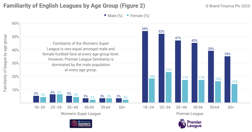The Women’s Super League draws its strongest relative familiarity from the 25 to 34 age bracket, with 30% of men and 33% of women European football fans in this age group claim familiarity with the league, indicating the potential to develop a long-term fan base.