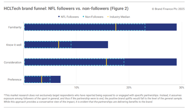 When these metrics are combined into Brand Finance’s Brand Strength Index (BSI), the effect is clear.HCLTech’s overall BSI among all respondents stands at 80.1, compared to 79.5 when NFL followers are excluded — a net lift of 0.6 points. The strongest gains appear in consideration, where NFL fans score HCLTech at 8.7 versus 8.3 among non-fans. Consideration is a key indicator of future market share growth, making this uplift especially significant in demonstrating how the sponsorship translates into commercial advantage.