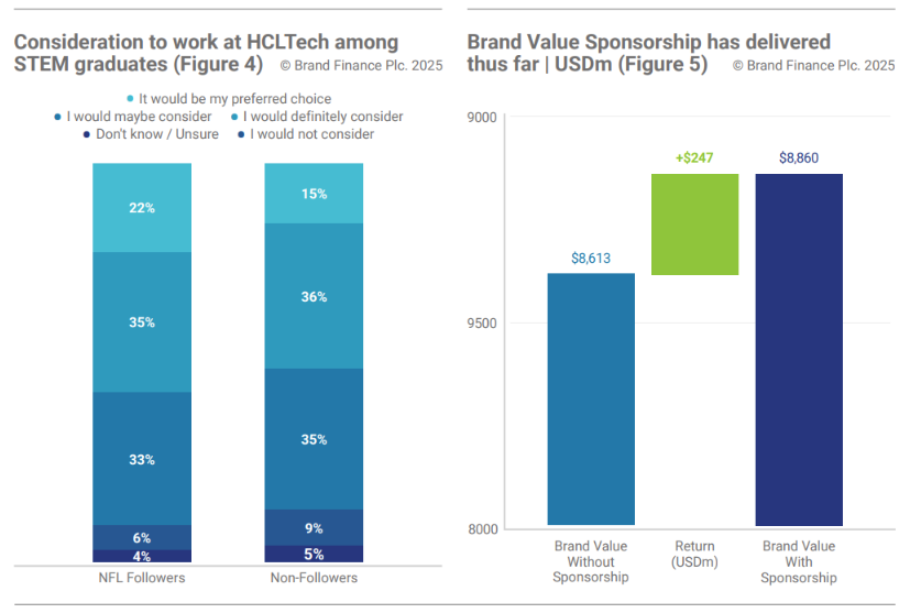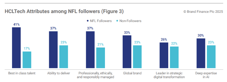 This partnership is not in name only. Brand Finance analysis finds it has already contributed USD247 million to HCLTech’s brand value and lifted its Brand Strength Index (BSI) score by 0.6 points, which equates to 2.9% of HCLTech’s USD8.8 billion 2025 brand valuation, over the three years since the partnership began. This is based on the quantification of the impact of improved perceptions and behaviors towards HCLTech among an audience of 1,003 IT decision makers (ITDMs). Brand Finance takes the conservative view that ITDMs who follow NFL are likely exposed to the partnership, with the results showing that this segment perceive and engage with HCLTech much more favorably than those who don’t follow the sport.