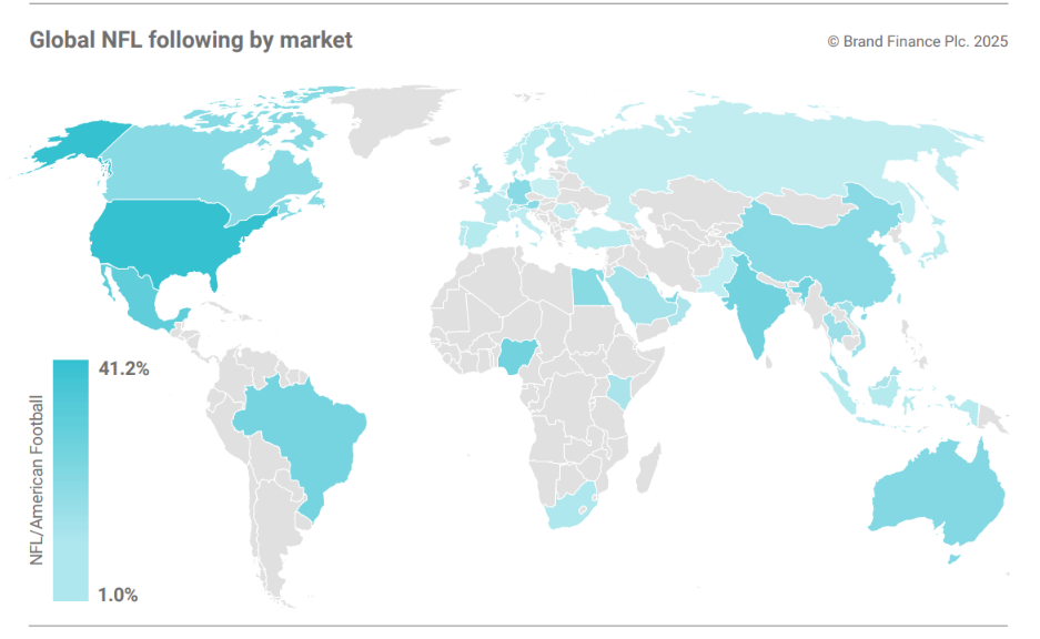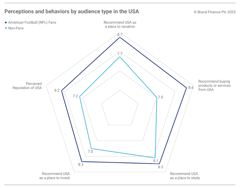 Brand Finance Global Soft Power data shows that followers of American Football (NFL) are much more likely to perceive the USA as having a greater reputation, and are more likely to recommend the USA as a place to visit, invest, study and buy products.