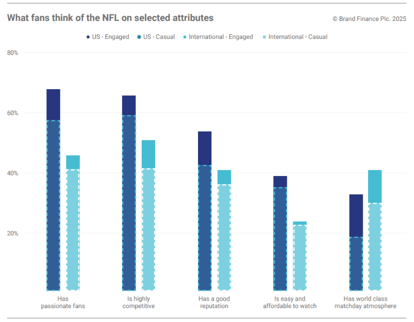 EUS audiences who follow the NFL closely perceive the league much more favorably on key functional and emotional attributes that drive following and purchase behaviours, than international fans. This includes being easy and affordable to watch, having a good reputation and being highly competitive.