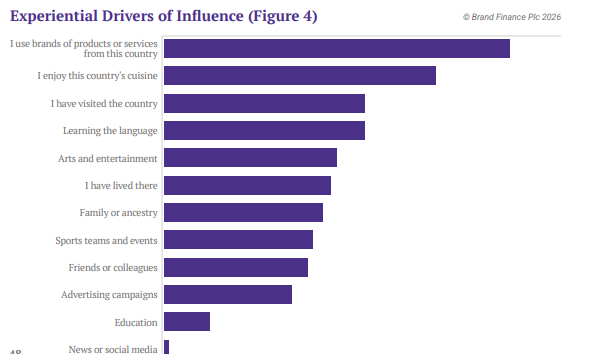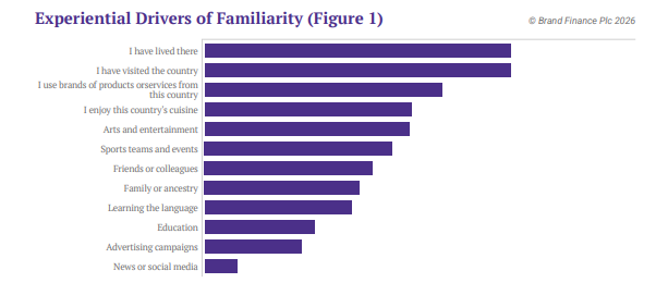 Beyond that, Familiarity is strengthened by repeated, everyday exposure: using that country’s products and services, engaging with its culture through cuisine, arts and entertainment, and following sports teams and events. By contrast, news or social media is the weakest driver of Familiarity. This is not an argument against media visibility. It is a reminder of what visibility can and cannot do.