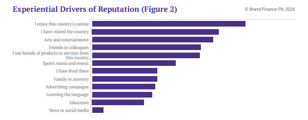 But these perceptions do not form in a vacuum. They are shaped by experiences: what people watch and read, where they travel, the culture they consume. That is why, alongside our established analysis of perceptual drivers, we tested an experiential layer this year. We asked respondents who said they know a nation what actually made it familiar to them and modelled how those experiences connect not only to deeper Familiarity, but also to stronger Reputation and Influence.
