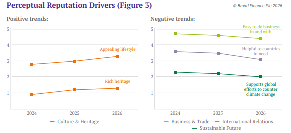 Longer-term trends in the perceptual drivers point in the same direction. Across all pillars, appealing lifestyle and rich heritage show the strongest positive movement, increasing most significantly in the past three years (Figure 3). This sits alongside the growing role of travel experience in shaping reputation with tourism-linked associations such as great place to visit and Friendly people recording the largest jumps last year. Taken together, the trends suggest that Reputation is built when a country is associated with experiences people enjoy, aspire to, and talk about – and when those experiences feel authentic rather than engineered.