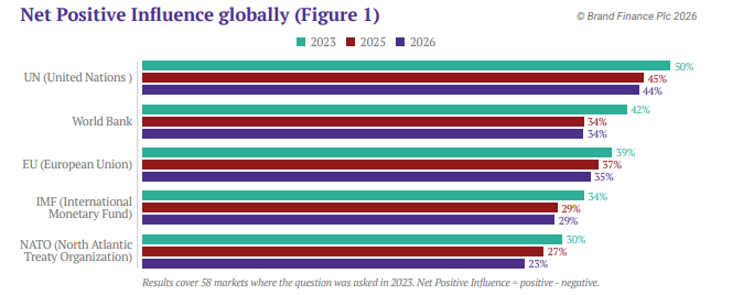 Brand Finance’s Global Soft Power Index research consistently shows that soft power is highly sensitive to this emotional climate. When optimism fades, appreciation becomes harder to sustain. Institutions that once symbolised reassurance and stability are more readily associated with inadequacy, even when their underlying role remains vital.