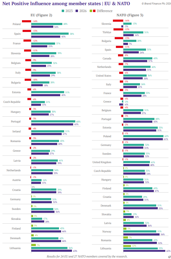 Importantly, this softening in perceptions is not confined to audiences outside these institutions. A closer look at sentiment within member states themselves suggests a similar pattern. Among European Union nations, 17 of the 24 included in the analysis (see chart 2) registered a decline in perceptions of the EU’s net positive influence since 2023. The same pattern appears within NATO, where also 17 of the 27 NATO member nations researched (see chart 3) recorded a softening in sentiment. This points to a more complex dynamic, in which confidence is being reassessed not only from the outside, but from within.