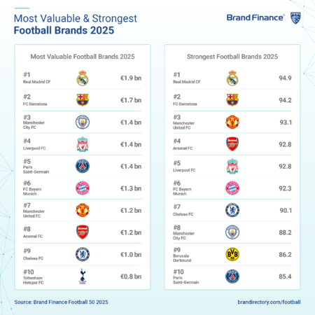 Real Madrid and Barcelona are the two most valuable and strongest football club brands in the world. Real Madrid’s brand value rose 14% to EUR1.9 billion, while Barcelona’s increased by 11% to EUR1.7 billion. Both clubs also received AAA+ ratings for brand strength.