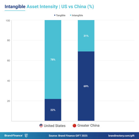Brand Finance’s research data shows China’s intangible asset value has grown from 15% in 2024 to 31% in 2025. Even so, the country remains predominantly tangible in comparison to others in the region. Historically, China’s economy has been largely rooted in mining and manufacturing – industries that are capital-intensive and rely heavily on assets. However, the recent expansion of its technology sector is gradually shifting the country towards having more intangible assets.