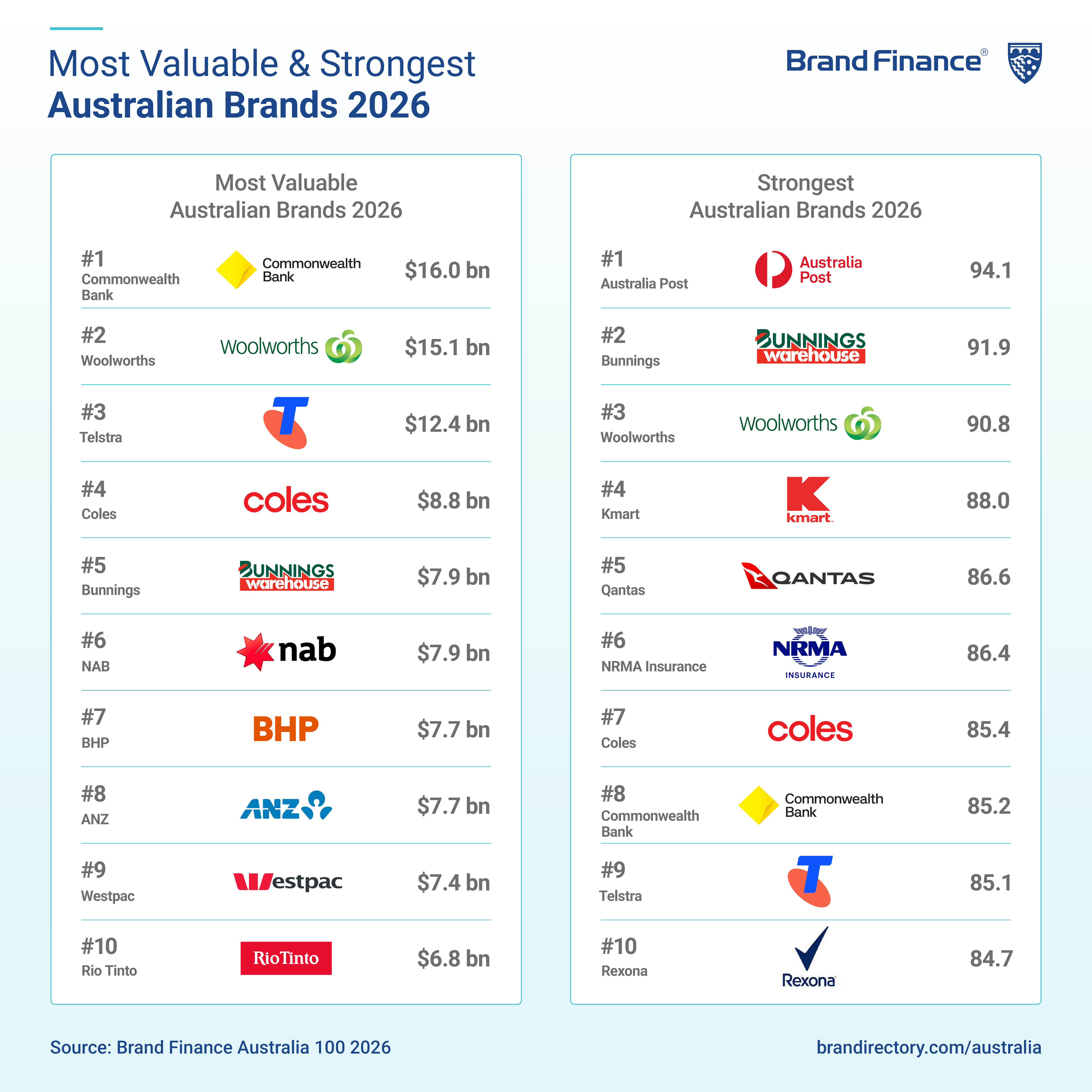 Bunnings (brand value up 16% to AUD7.9 billion) ranks second in brand strength, with community initiatives like the ‘Legend of the Tongs’ AFL campaign and strong operational performance reinforcing consumer trust.
