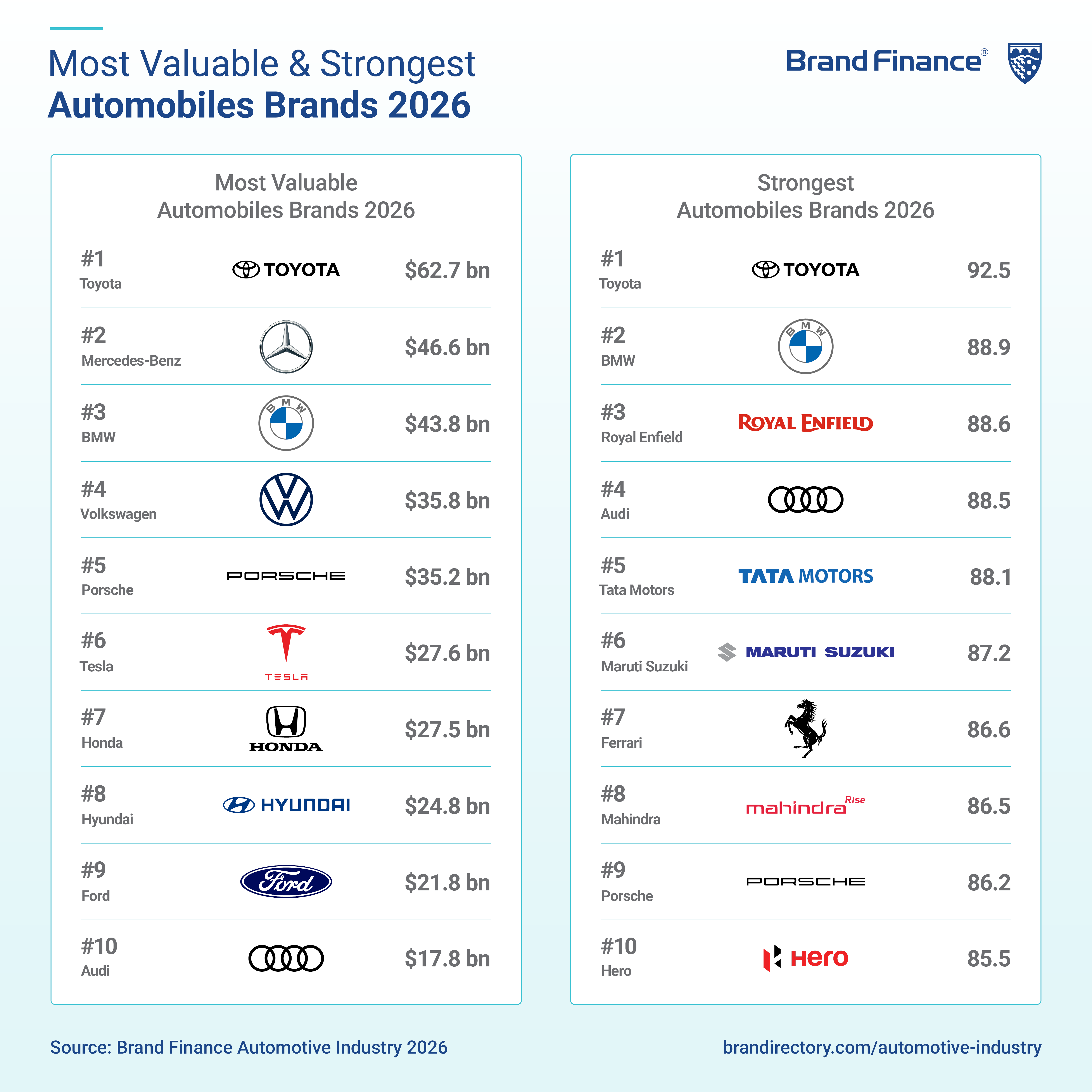 The global automobile sector recorded consecutive declines, falling 1% in 2025 and a further 7% in 2026, with total brand value now standing at USD575.4 billion. Despite this broader slowdown, Toyota (brand value down 3% to USD62.7 billion) retains its position as both the most valuable and strongest automobile brand globally for the second consecutive year. With a BSI score of 92.5/100 and an AAA+ rating, Toyota continues to benefit from high visibility, strong familiarity, and a reputation for reliability across key markets including Japan, China, India, Malaysia, Singapore, France, Spain, Norway, Denmark, and Australia.
