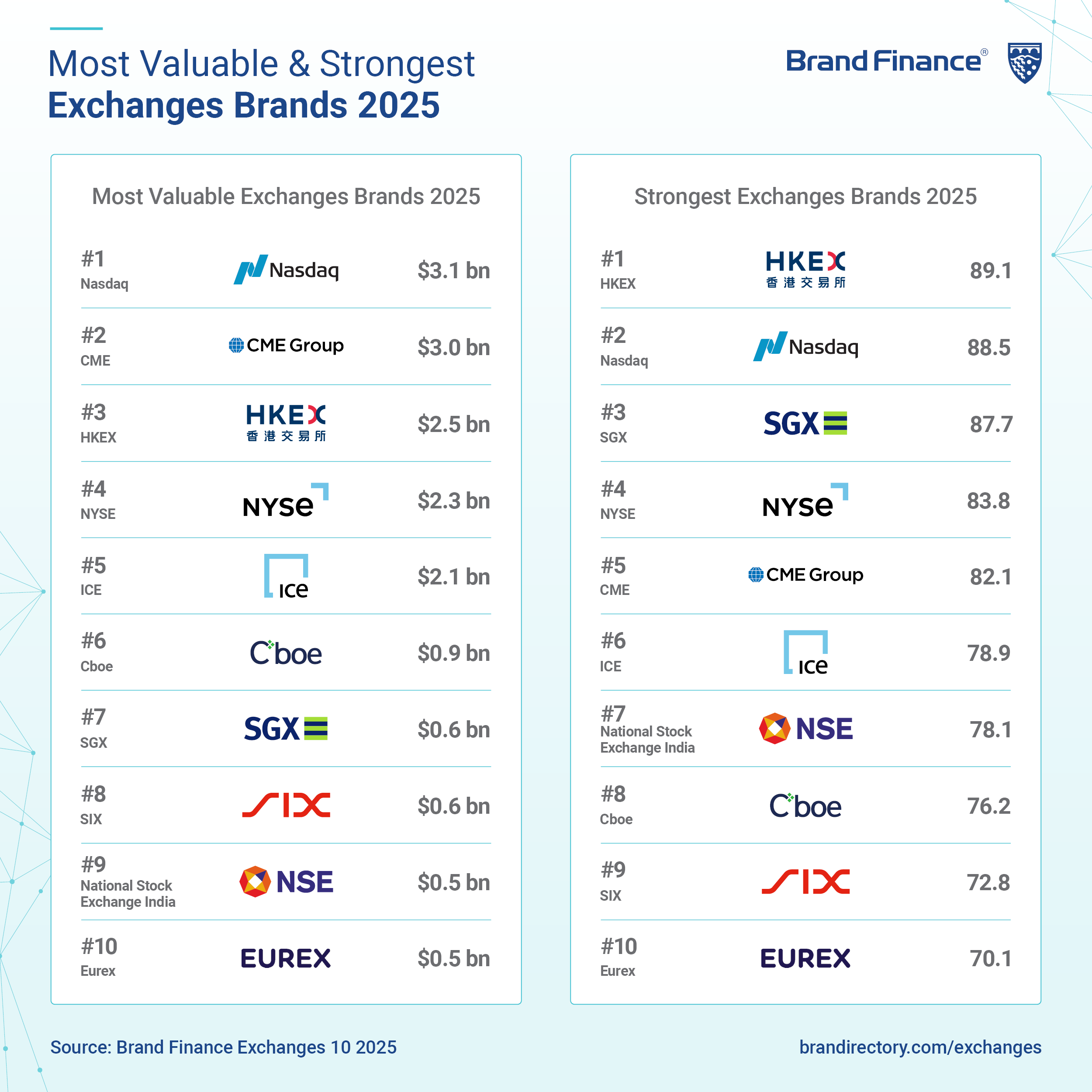 LONDON, 19th August 2025Nasdaq has become the world’s most valuable exchanges brand for the first time, according to a new report from Brand Finance, the world's leading brand valuation consultancy. Nasdaq’s brand value has grown 33% to USD3.1 billion, meaning it has overtaken CME to hold the top spot. This comes despite CME’s strong brand value growth of 24% to USD3 billion.