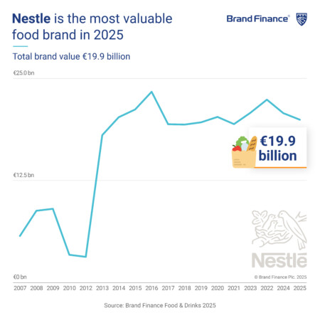 LONDON, 6 August 2025 – With a brand value of USD20.0 billion, Nestlé remains the most valuable food brand globally for the tenth year running, according to a new report from Brand Finance, the world's leading brand valuation consultancy. Despite experiencing a small decline in brand value, down 4% from 2024, Nestlé’s brand value remains more than USD7.0 billion greater than the second most valuable food brand, Lay’s, with a brand value of USD12.7 billion.