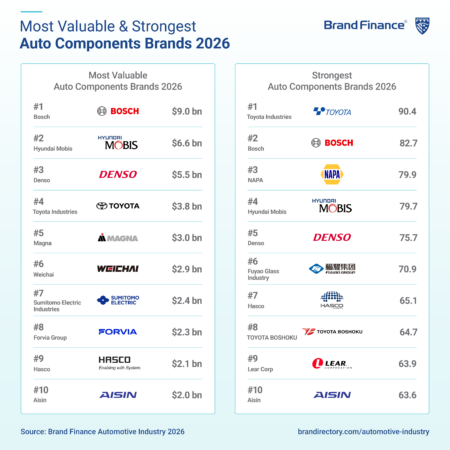 Beyond vehicle manufacturers, Bosch (brand value up 24% to USD9 billion) retains its position as the most valuable auto components brand in 2026, supported by its scale, diversified portfolio, and comparatively resilient risk profile.