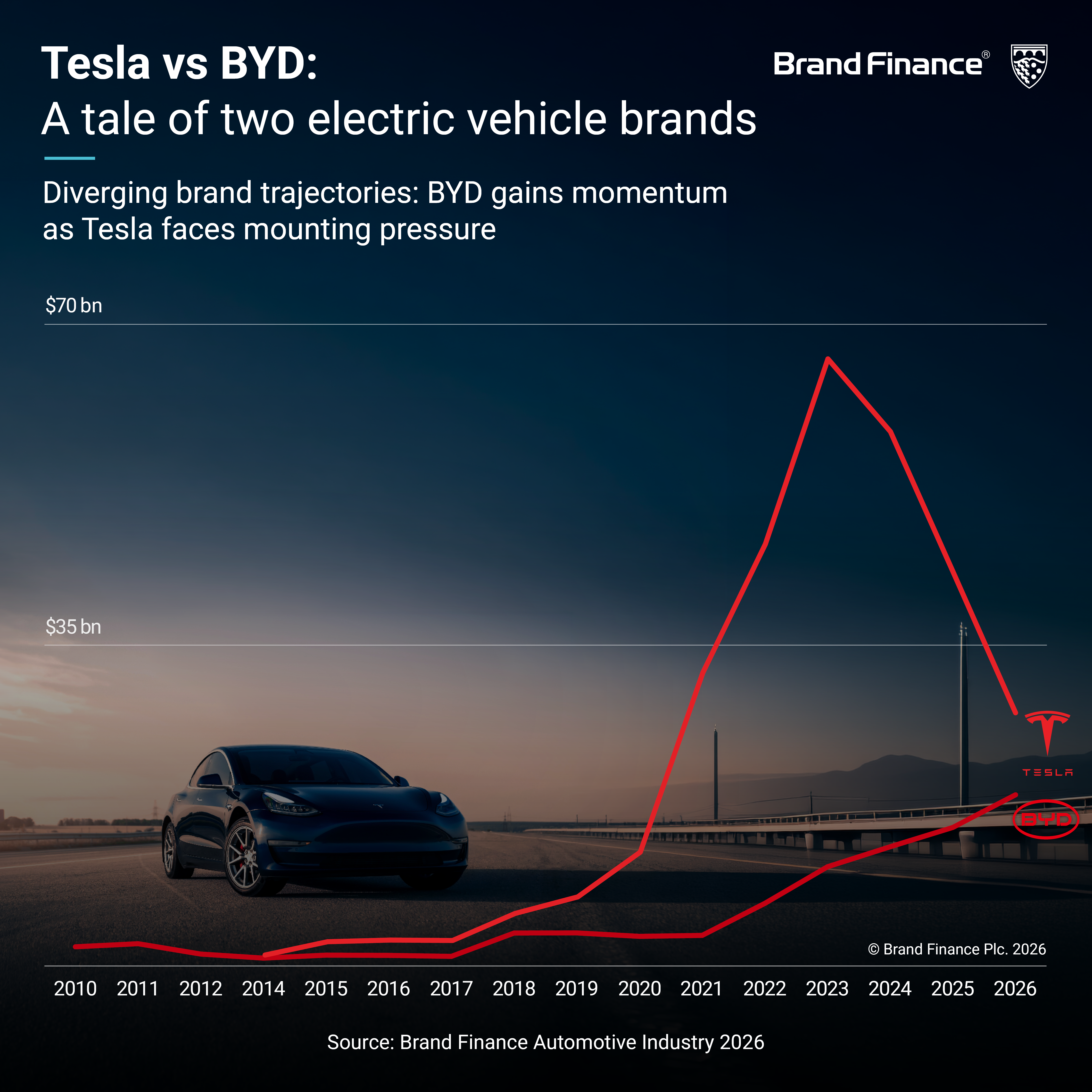 The global EV sector is increasingly defined by diverging brand trajectories, with Tesla and BYD exemplifying this shift. Once the undisputed pioneer of electric mobility, Tesla (brand value down 36% to USD27.6 billion) fell three places to sixth, recording one of the largest brand value declines in the sector. In contrast, BYD (brand value up 23% to USD17.3 billion) continues to gain ground, rising to 11th globally.