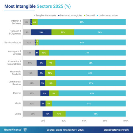 On a global level, the U.S. has overtaken Denmark to become the most intangible market in the world. The total intangible value of the U.S. market stands at 78%, while Denmark’s intangibility has dropped from 82% in 2024 to 67% in 2025.