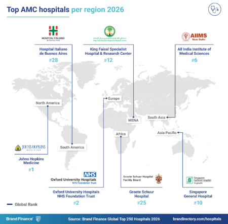 Top-performing hospitals in key markets include All India Institute of Medical Sciences (AIIMS) as the leading hospital in the South Asia region. Singapore General Hospital has regained its position in 2026 as the leading hospital in the APAC region. King Faisal Specialist Hospital & Research Center (MENA) and Groote Schuur Hospital (South Africa) maintain their respective regional leader positions, while Hospital Italiano de Buenos Aires in Argentina has climbed eight places to 28th globally to become the most reputable AMC brand in South America.